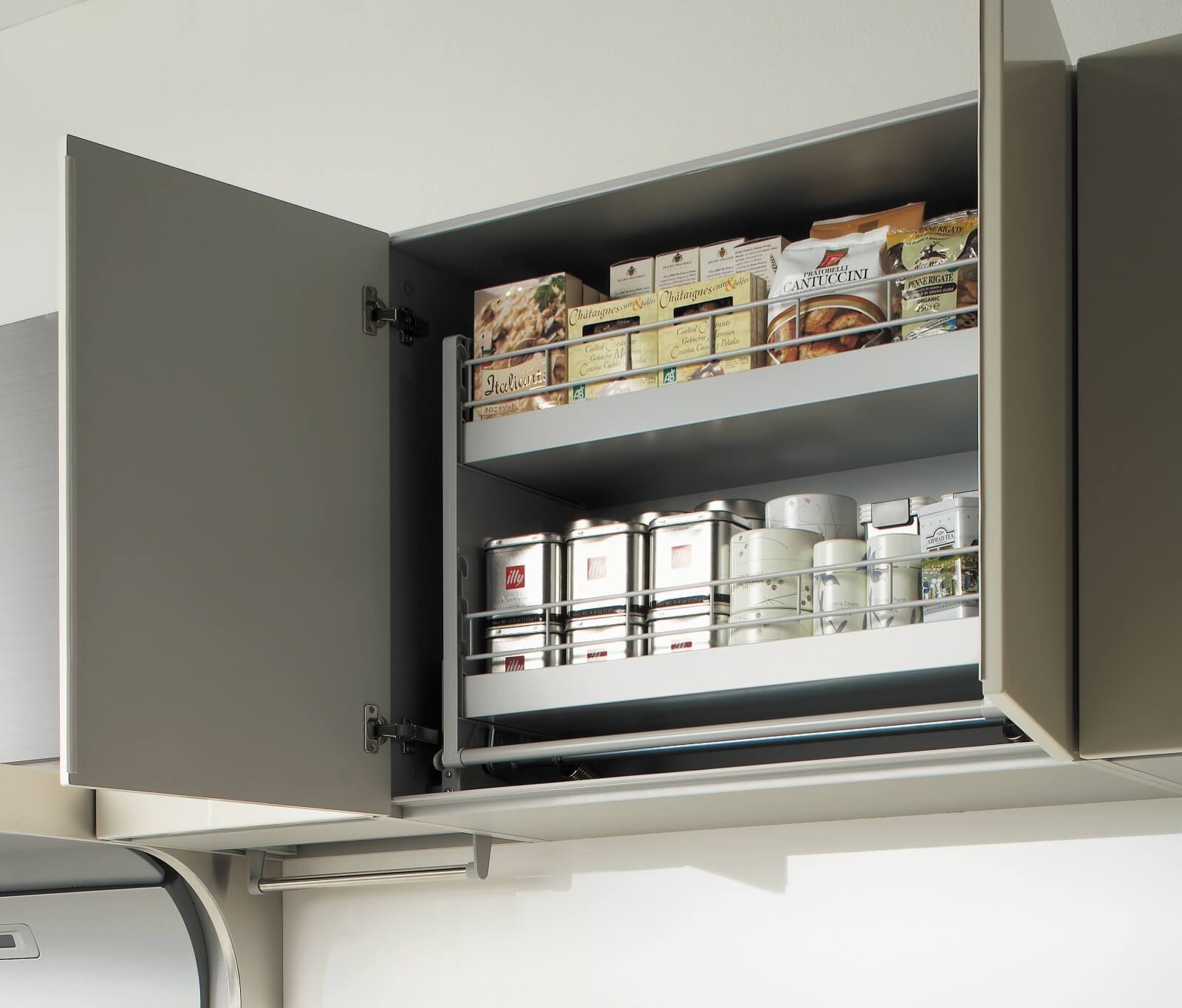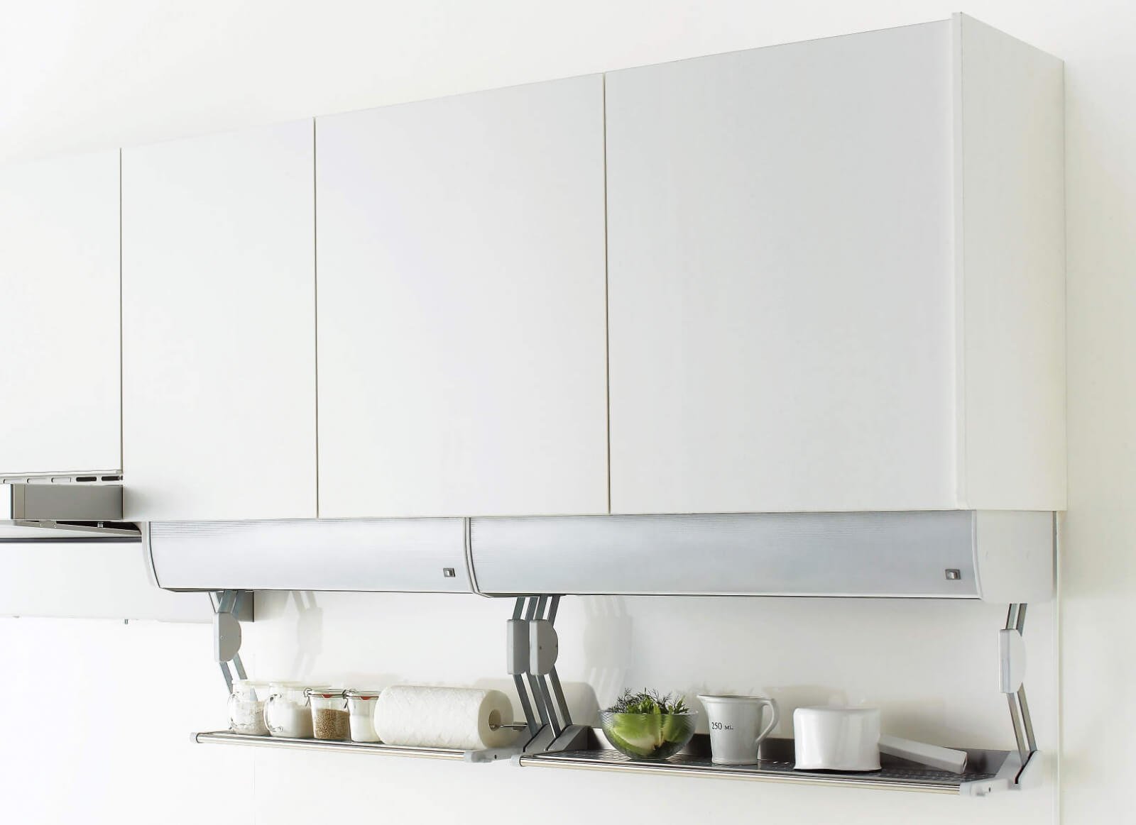充分利用吊櫃的收納空間,輕輕往下拉即可拿取上櫃收納的物品,附加重量調整的機能,使拉取更輕鬆